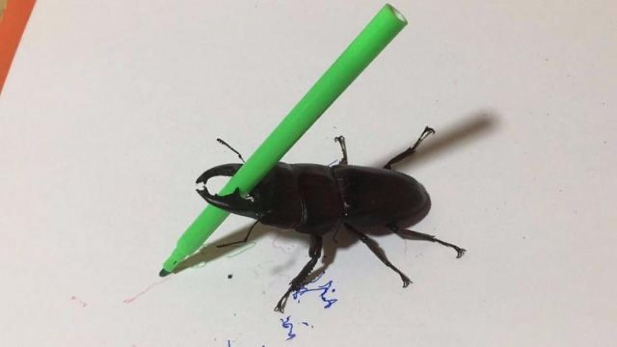 Amb les seves poderoses garfas, l'escarabat "Spike" és capaç d'agafar petits objectes, en aquest hilarant cas, bolígrafs i retoladors, amb els quals pot pintar i demostrar l'artista que porta dins de la seva closca.