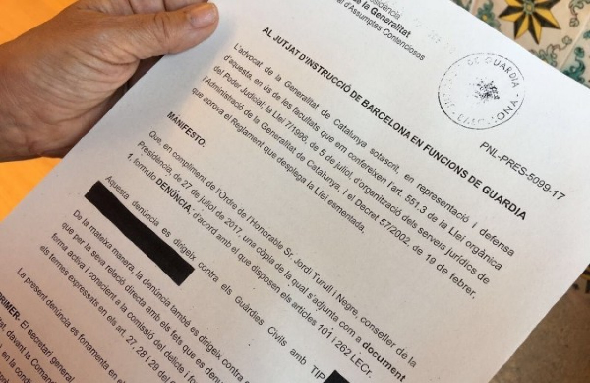 El Govern ha presentat aquest dissabte una denúncia contra els agents de la Guàrdia Civil responsables dels interrogatoris a diversos càrrecs de la Generalitat realitzats aquesta setmana relacionats amb els preparatius del referèndum.