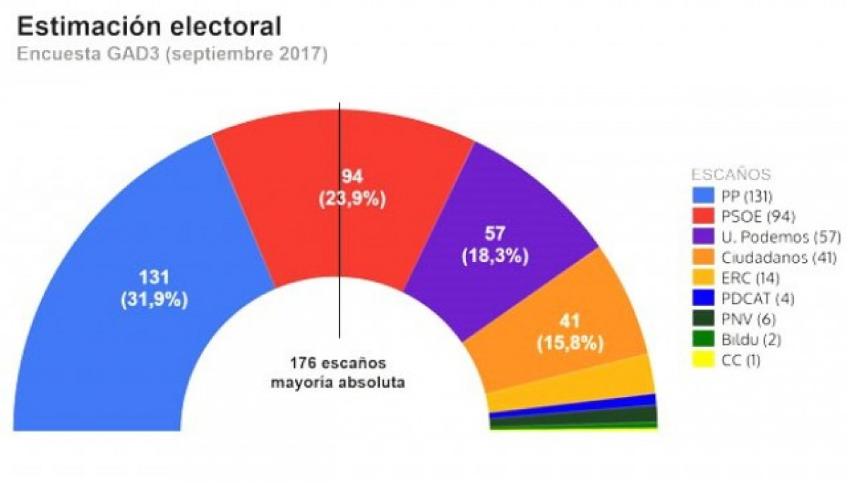 La perspectiva d'un canvi de Govern a Espanya amb l'aliança de PSOE i Podemos es dilueix davant l'estimació de vot que reflecteix aquesta enquesta. Així, PP i Ciutadans augmenten el seu avantatge a 21 escons enfront dels seus dos rivals de l'esquerra, vuit més que en les eleccions de juny de 2016.