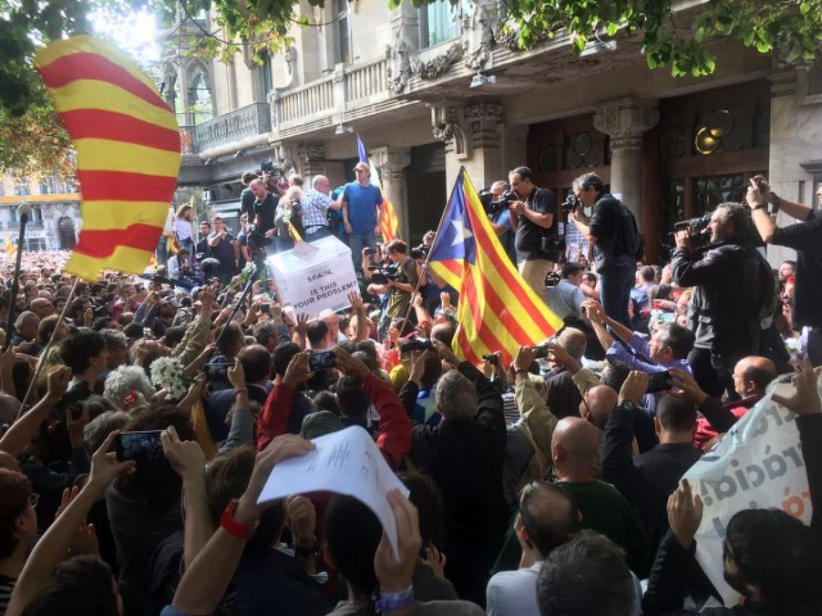 Més de 2.000 persones es concentren el matí d'aquest dimarts davant la seu de la Conselleria d'Economia, a la Rambla de Catalunya de Barcelona, durant un registre de la Guàrdia Civil contra l'organització de l'1-O, i tallen la Gran Via entre Passeig de Gràcia i el carrer Balmes.