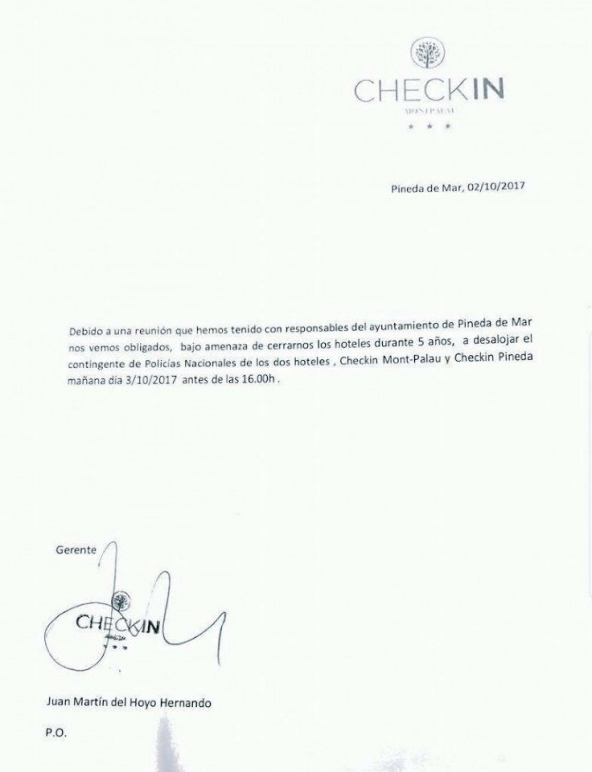 En el seu escrit, també al·ludeix a un document "suposadament" signat pel gerent de la cadena d'hotels Checkin que afirmava haver tingut una reunió amb els responsables de l'Ajuntament de Pineda i que es veuen obligats a desallotjar de dos dels seus establiments: Sota amenaça de tancar-nos els hotels durant cinc anys, diu aquest comunicat que ha circulat per xarxes socials.