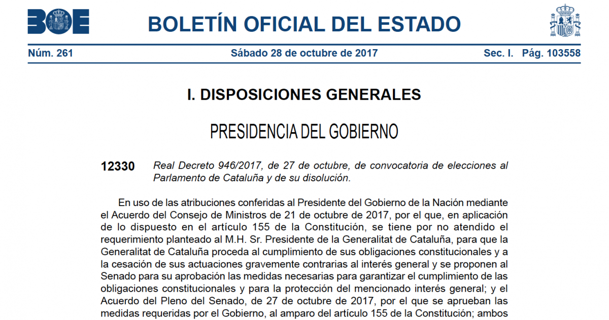 La publicació del BOE inclou, a més, la dissolució del Parlament de Catalunya, triat el 27 de desembre de 2015 i recull la convocatòria d'eleccions previstes per al proper 21 de desembre. Les circumscripcions electorals de Barcelona, Girona, Lleida i Tarragona triaran, respectivament, a 85, 17, 15 i 18 diputats.