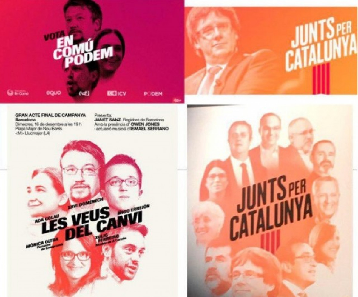 Els cartells de campanya per a les eleccions del 21D de la llista de Puigdemont guarden alguna cosa més que una semblança raonable amb els de Domènech.