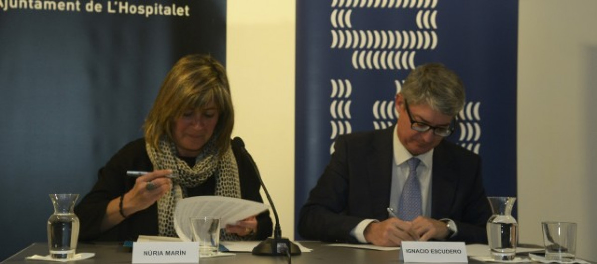 L'alcaldessa de La Hospitalet, Núria Marín, i el director general d'Aigües de Barcelona, Ignacio Escudero, han signat el protocol per afrontar l'emergència en l'àmbit de la pobresa energètica.