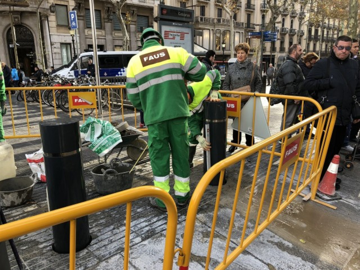 El matí d'aquest dimecres els operaris estaven col·locant pilons a la part superior del passeig, la més propera a la plaça Catalunya, per la qual va entrar el vehicle que conduïa Abouyaaqoub.