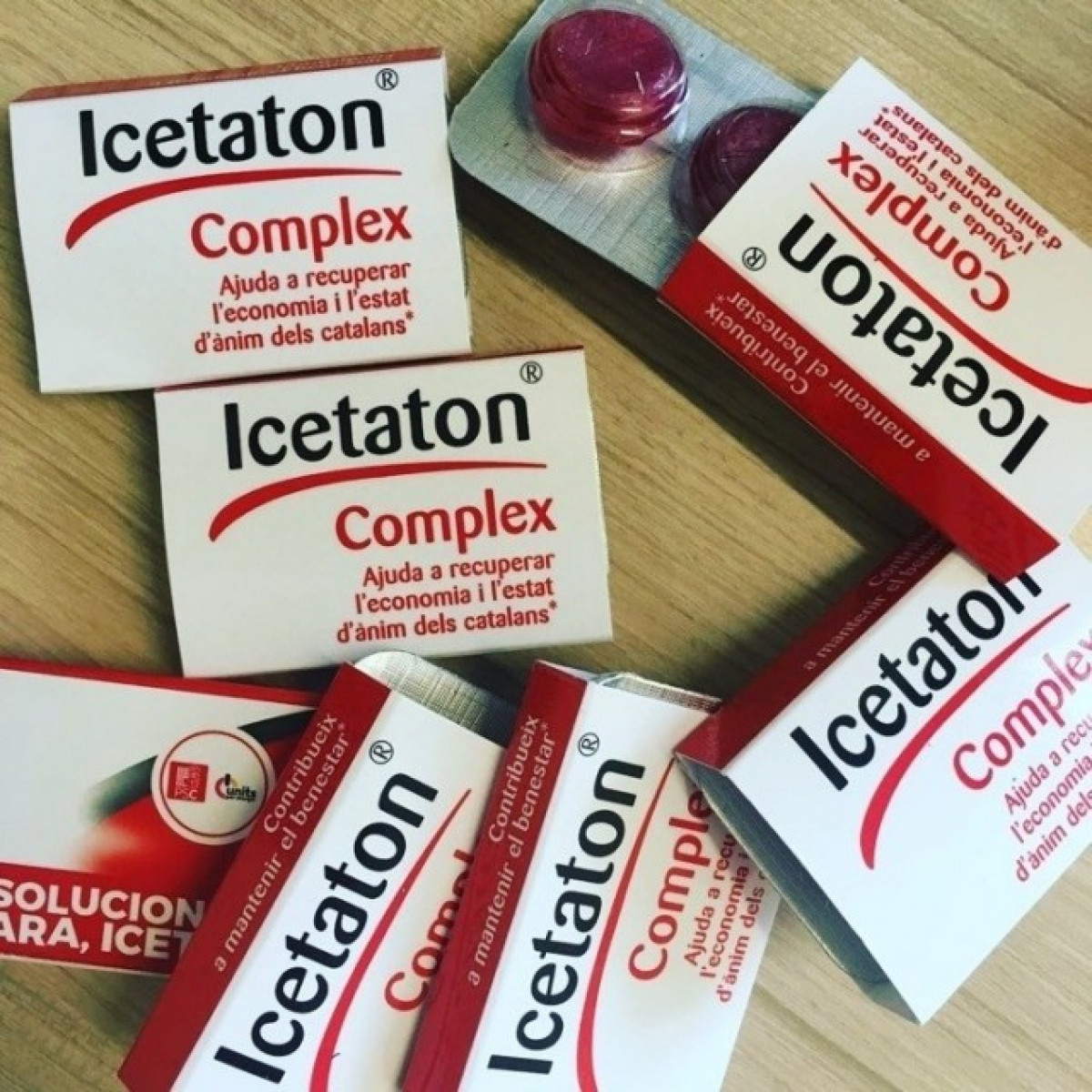 En el missatge mostra una caixa de pastilles de la marca Icetaton, que "ajuda a recuperar l'economia i l'estat d'ànim dels catalans".
