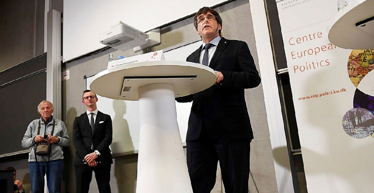 Puigdemont durant la seva intervenció a Copenhaguen.
